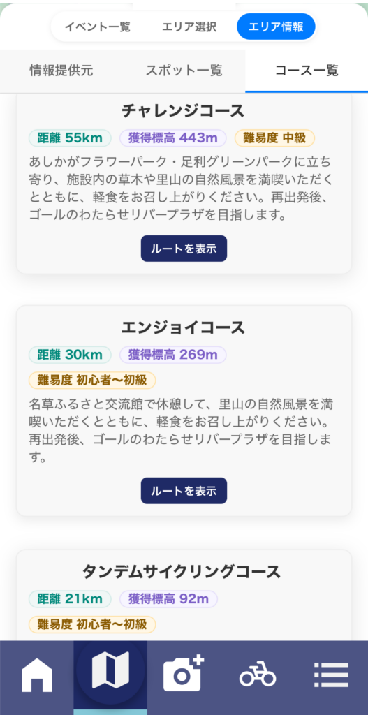イベントでは55kmを走る中級者向けのチャレンジコース 、30kmの初心者向けエンジョイコース、二人乗りのタンデム自転車で走るタンデムコースをSEEKCROWで表示し、ルートやコースの概要などを見ることができます。当日、多くの人にダウンロードして利用いただきました。