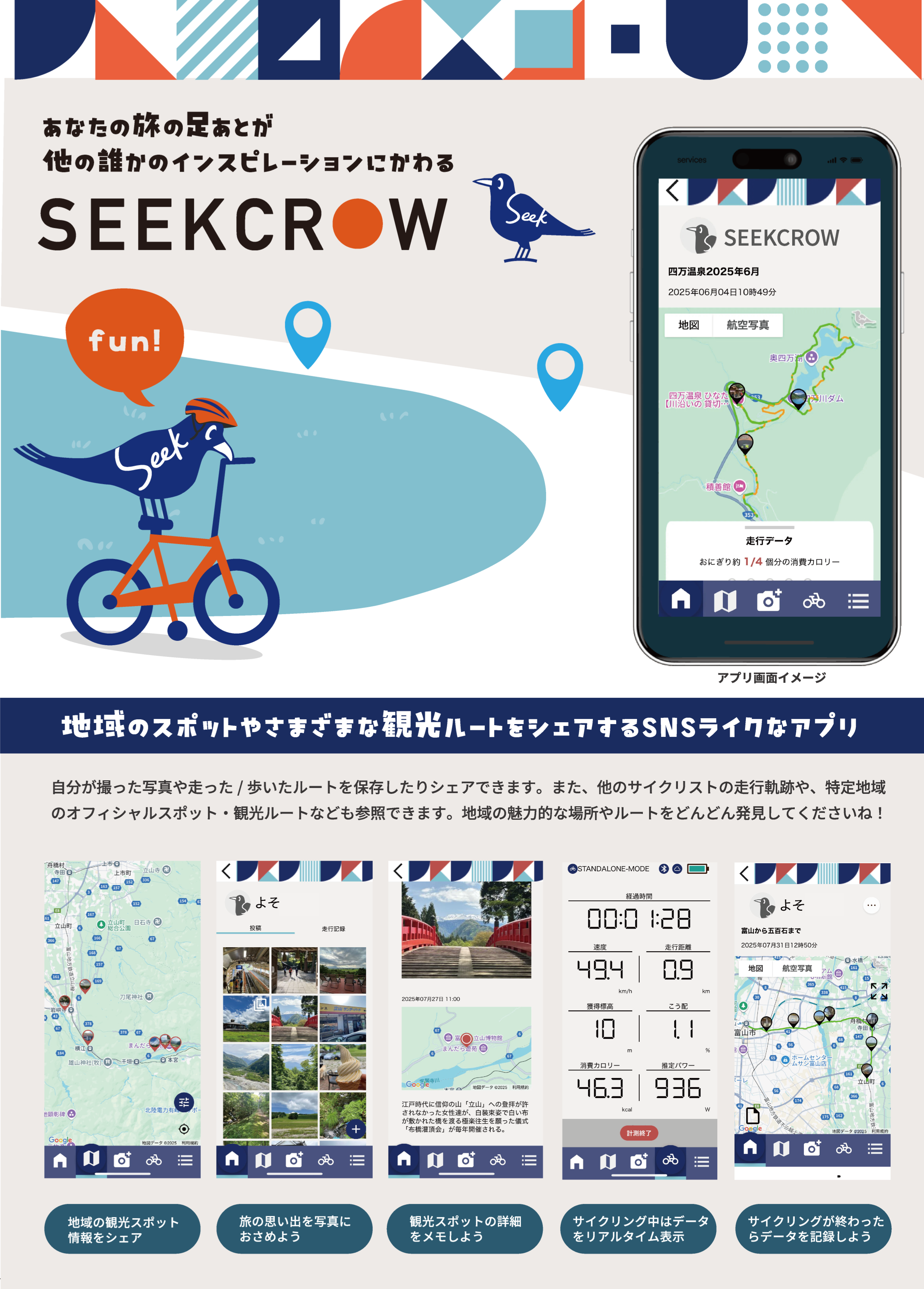 イー・フォース株式会社は、地域スポットやさまざまな観光ルートをシェアするSNSライクなアプリ「SEEKCROW」を公開しました。自分が撮った写真や自転車で走った(徒歩で歩いた)ルートを保存したりシェアしたりできます。また、他のサイクリストの走行軌跡や、特定地域のオフィシャルスポット・観光ルートも参照できます。