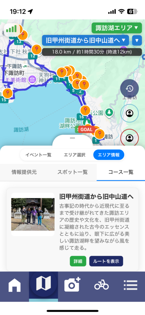 はあえてメインに置かず、諏訪湖から少し山側に入った旧甲州街道沿いを走りながら、歴史の気配を感じられるエリアや、人があまり訪れない景色の良いコースを中心に造成しました。