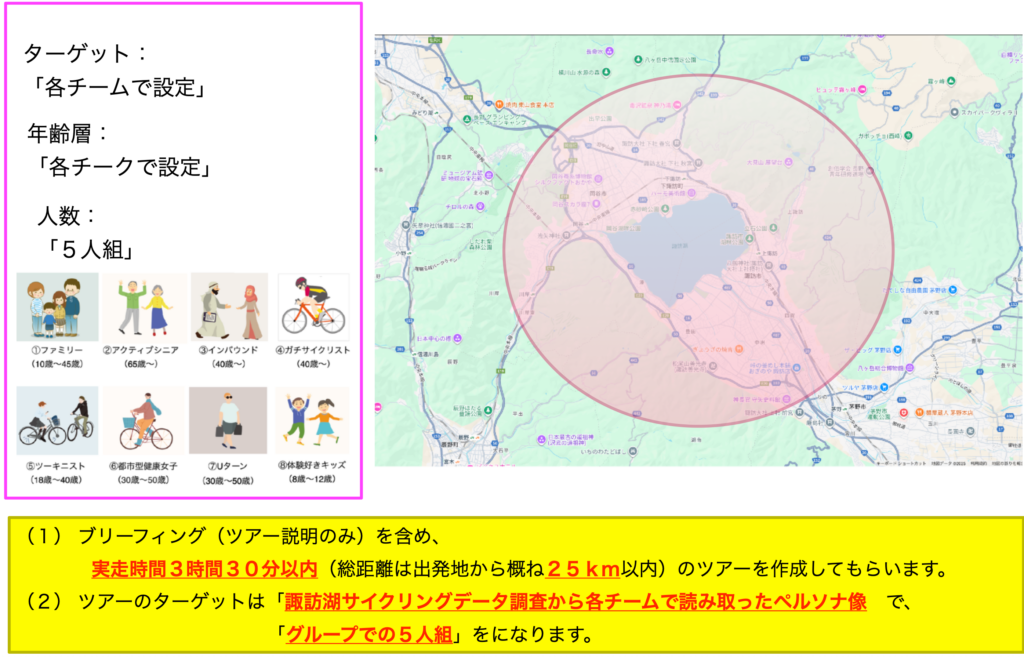 今回のフィールドは、長野県の諏訪湖エリアです。3日間かけて参加者を4チームに分け、それぞれのチームでオリジナルのサイクルツアーを造成しました。初日の午前中は、まず全員でモデルコースを周り、ツアーを一度体験します。午後はチームごとに分かれて諏訪湖エリアを散策し、ルート候補や立ち寄りスポットを視察しました。ツアー造成には、いくつかのルールや前提条件が設けられており、その範囲の中で各チームが自由に企画を組み立てていきます。